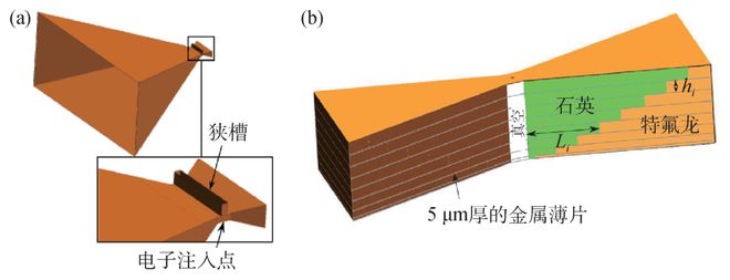 该研究组通过模拟继续对电子枪结构和性能进行优化设计,采用尺寸渐变的矩形波导作为电子枪的主体结构,在间隙内对电场和磁场进行聚焦(图2(a)),同时在波导的另一端添加短路面使得反射波与入射波相干叠加,进一步提高了间隙内的加速电场。通过在波导内添加长度和厚度不同的介质层对太赫兹波的波前进行适当的时间延迟,使得产生的光电子在通过每层的加速间隙时都处于加速相位,能够极大地提高太赫兹波的利用率。此外,采用双馈的方式从电子枪的两端耦合两束电场方向相同、传播方向相反的太赫兹波,能够在加速间隙内实现电场相加,磁场相消的叠加效果,进一步提高了电子枪的加速效率,如图2(b)所示[7]。