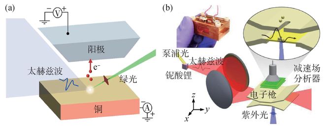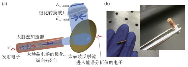图4 (a)太赫兹电子加速的原理性验证实验示意图;(b)两张图是太赫兹介质管加速器的实物图[3]