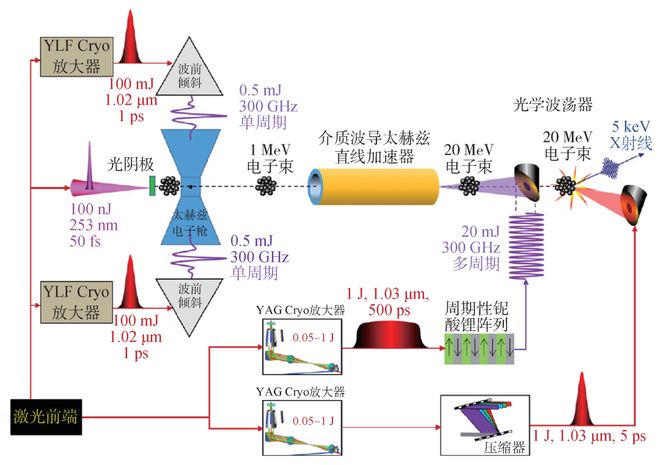 德国的DESY在2018年提出了利用全光太赫兹加速器产生阿秒X射线的阿秒X射线成像和光谱科学(Attosecond X-ray Science:Imaging & Spectroscopy,AXSIS)方案[37]。方案围绕高品质红外激光展开:一路激光四倍频到紫外波段后驱动光阴极产生光电子;另外两路激光经过光整流分别产生单脉冲和多脉冲,驱动太赫兹电子枪和介质管加速结构,将电子束加速到20 MeV;第四路激光作为光学波荡器,大大提升其等效波荡器常数,使数十兆电子伏特的电子束就能辐射出X射线所示。由于太赫兹加速器的高梯度使得前端的加速器装置尺寸大大减小,以及光学波荡器的采用,整个装置可以集成到桌面的尺度。同时,紫外激光、太赫兹波、光学波荡器都是同源的,彼此之间具有非常好的时间同步特性,预期辐射出来的X射线具有高的品质和稳定性。