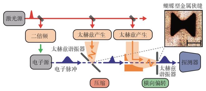 德国慕尼黑大学的研究组在2016年最先开展了用太赫兹波压缩和测量电子束长度的实验,如图8所示,他们用多周期太赫兹脉冲45°照射一个蝴蝶型的金属狭缝,产生纵向的加速电场,该结构可以增强太赫兹的电场。电子束中心通过太赫兹波负斜率的过零相位,电子束的头部被减速,尾部被加速,经过漂移后,束团的尾部电子追上头部电子,使得束长被压缩。为了研究束团压缩情况,采用另外一束太赫兹波以90°照射另外的蝴蝶型狭缝,产生横向的偏转电场,电子束经过狭缝时,不同纵向位置的电子感受到不同的偏转力从而在下游的观测屏上发生不同程度的位置偏移,经过标定后,即可根据探测器上电子束的分布信息反演出电子束的纵向分布信息,同时还可以根据探测器上电子束中心的偏移信息反演出电子束的到达时间信息[19]。