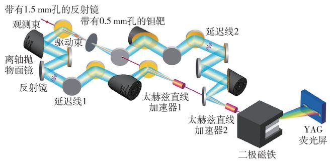 由于目前由激光到太赫兹的转化效率还不高(约1%),单个加速结构中太赫兹脉冲与电子束的作用长度有限,因此单段太赫兹加速的绝对能量增益还不高。为了得到高能量电子束,需要探索太赫兹的级联加速。2020年,DESY研究组利用两根介质加载圆波导首次演示了低能电子束的级联太赫兹加速。实验利用周期性极化铌酸锂(PPLN)产生线偏振多周期太赫兹波,在第一根介质管加速器中对电子束进行第一次加速,再利用两个太赫兹透镜收集从第一个介质管中辐射出来的太赫兹波,并耦合到第二根介质管中对电子束进行二次加速。实验中观测到了束团加速、纵向压缩和横向聚焦的效果,级联实验得到了1.6 keV的能量增益[14]。2020年,清华大学利用束流驱动的太赫兹源驱动介质管加速器对相对论电子束进行加速实验研究,首次实现了太赫兹加速器对相对论电子束的级联加速方案。研究团队利用传统加速器产生两个电子束,前面的电子束打在金属靶上产生前向和后向的相干渡越辐射。利用光路收集前向和后向的太赫兹波分别耦合到两根太赫兹介质管加速器中建立加速场,对后续进入介质管的第二个电子束进行加速,如图6所示。该方案利用同源的驱动激光在加速器束线上同时产生强太赫兹波和超短的相对论电子束,并保证了二者天然的时间同步特性,使得强太赫兹电场能够稳定地对相对论电子束进行同步加速。两级加速的能量增益达到了204 keV,单级加速的有效梯度达到了155 MV/m,该加速梯度和能量增益是当前太赫兹加速领域的最高实验记录值。单级加速和级联加速实验中都实现了清晰的全束团加速效果,为太赫兹加速走向应用奠定了基础[15]。随后,上海交通大学实现了光学太赫兹源对相对论电子束高效率的级联加速。实验采用两束基于周期性铌酸锂阵列产生的多周期太赫兹脉冲,在两根介质管加速器中对3 MeV的电子束进行级联加速,实现了1.5 keV/nJ1/2的高加速效率和几乎100%的电子束俘获效率,并观测到了30 keV的两级总能量增益[16]。这标志着级联太赫兹加速从原理验证走向了束流参数精细调控。