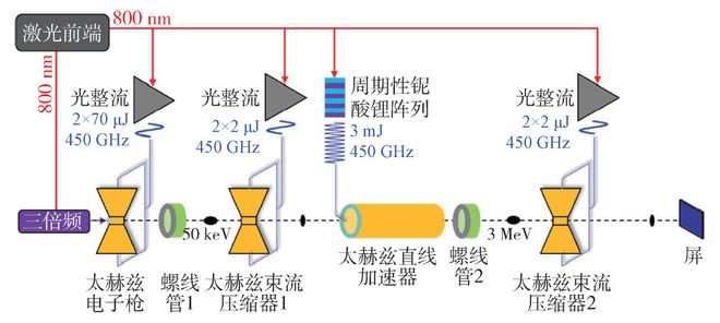 匈牙利佩奇大学的研究组2021年提出了非常有特点的全光太赫兹束线],整个束线处于真空中,没有具体化的加速结构,而是通过两组两束反对称传输的太赫兹波实现电场增强磁场相消,在电子束轴线上建立起强加速电场。电子束的产生是通过强激光电离气体产生等离子体,其中的电子被太赫兹波俘获并得到初级加速,然后再送到下一级主加速结构(与前级相似)中进一步加速。两级加速之间、主加速器和电子束应用点之间通过螺线管和太赫兹压缩器进行束流匹配,如图10所示。经过优化,该方案模拟实现了在147 mm的太赫兹加速器束线 keV的电子束,束团能散为2%。